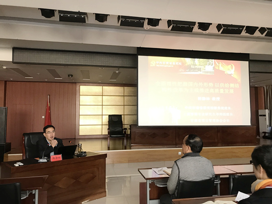 11月22日,研究所邀请甘肃省委党校教授、教务处处长、工商管理专业研究生导师组组长,甘肃省委讲师团成员鲜静林作《全面理性把握国内外形势 以供给侧结构性改革为主线推进高质量发展》专题报告会。报告会由杨志强所长主持,李建喜副所长、研究所全体职工和研究生参加报告会。