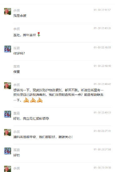 牵动着兰州牧药所的,还有远在武汉的兄弟所油料所。1月30的深夜,党办人事处处长荔霞收到了来自油料所综合处处长余波的一份特殊的新年问候。聊天记录是这样的: