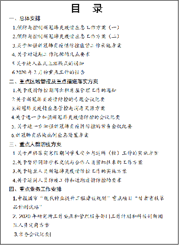 有了强有力的领导和统一指挥,还需要制订和完善规章制度来落实方略、明确责任,在日常管理与应急事件中稳定阵脚、有效应对。为此,研究所出台了一系列规章制度。总体安排方面,出台了《预防与控制新冠肺炎疫情应急工作方案(一)》《方案(二)》《关于加强新冠肺炎疫情防控监督工作实施方案》《关于对近期工作纪律的几点要求》《关于进入正式上班模式的通知》等。在重点区域管控及重点措施落实上,出台了《关于疫情防控期间出租房屋管理工作的通知》《新冠肺炎疫情应急管控与消毒灭源方案》《新冠肺炎感染病例应急处置方案》。在重点人群防疫方面,出台了《关于严格落实寒假期间学生安全与返所(校)工作的实施方案》《关于暂停国际学术交流与合作人员密切往来的工作方案》《关于返兰人员新冠肺炎疫情防控工作的实施方案》《关于返岗人员防疫工作和近期疫情防控的要求》等。此外,研究所先后召开8次视频会议(2月5日,2月7日,2月10日,2月13日2次,2月17日,2月19日,2月21日),部署疫情期间防控工作,以会议纪要的形式安排各项工作的开展和落实。同时,建立了多个微信工作群开展防控工作。
