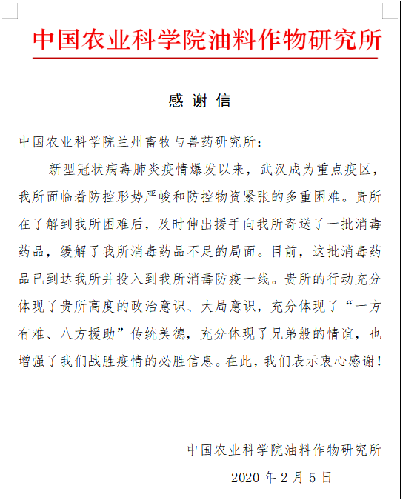 在这场战役中,兰州牧药所并不是一味防守,还有进攻的武器。所属企业生物科技研发有限责任公司生产一款消毒剂,强力消毒灵。在过去发生的几次自然灾害中,强力消毒灵都在灾后防疫中发挥了作用。在汶川、玉树,都有这款消毒药品的影子。此次疫情发生后,消毒剂变得格外珍贵,研究所更是重任在肩。1月26日,牧药所接到了一份由兰州市兽医局发来的紧急通知,呼吁为甘肃省防控新冠肺炎提供消毒剂。接到通知后,研究所立即组织货源,及时向有关单位发送了用于防控的消毒剂。1月30,研究所接到了位于武汉的兄弟所油料所消毒物资告急的信息。研究所想方设法向油料所支援了一批“强力消毒灵”,帮助兄弟单位做好疫情防控。2月5日,药品顺利到达油料所,缓解了兄弟所的燃眉之急。