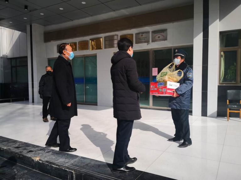 一线职工,是面临风险最多的人员。保障他们的安康,是防疫的重中之重。战斗在最前线的他们,也时刻牵动着所有职工及家属的心。所领导也心牵他们。18日上午,张永光带领疫情防控领导小组成员深入到研究所大门、科苑东西楼、伏羲宾馆等关键防控点,了解各防控点人员出入登记、体温检测、消毒灭源、轮岗值守等情况和遇到的问题,并代表所领导班子向一线值守人员表示慰问,送上方便面、火腿肠、酸奶等慰问品,感谢他们为守护研究所安全所付出的辛勤劳动,叮嘱他们既要做好疫情防控工作,也要做好自身防护。与此同时,张继瑜带领防控办工作人员到位于大洼山基地的生物科技研发公司,了解生产复工情况,慰问看望一线生产人员。他在鼓励大家坚定信心、勇于担当的同时,要求做实做细各项防控防护措施,确保人员安全。